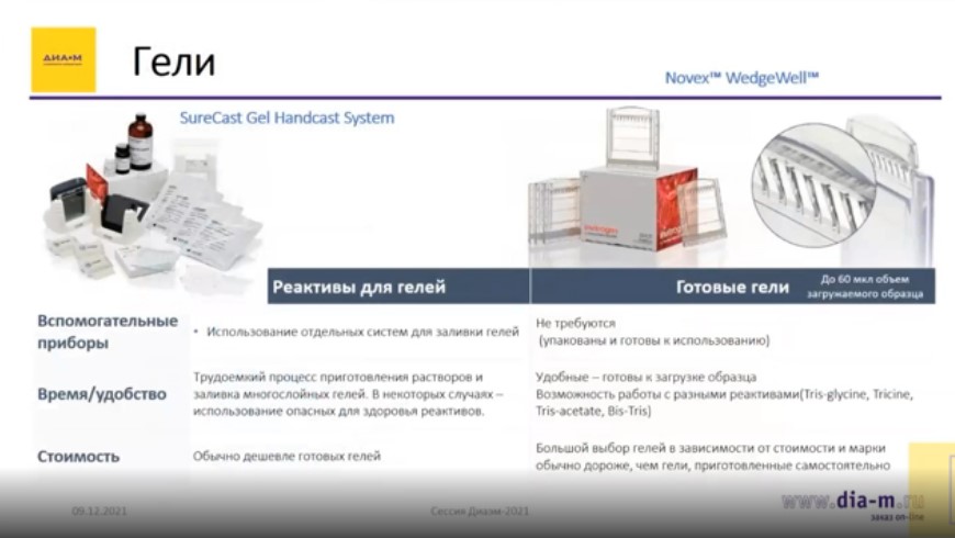 Другое дело – использовать готовые гели. Компания Thermo FS и ее подразделение InVitrogen выпустили готовые гели сразу в пластиковой подложке, что делает их использование максимально удобным, а главное – дает, пусть и при более высокой стоимости, колоссальную экономию времени, потому что они упакованы и сразу готовы к использованию, сразу готовы к загрузке образца объемом до 60 мкл, подразумевают возможность работы с разными реактивами (трис-глицин, трицин, трис-ацетат, бис-трис).