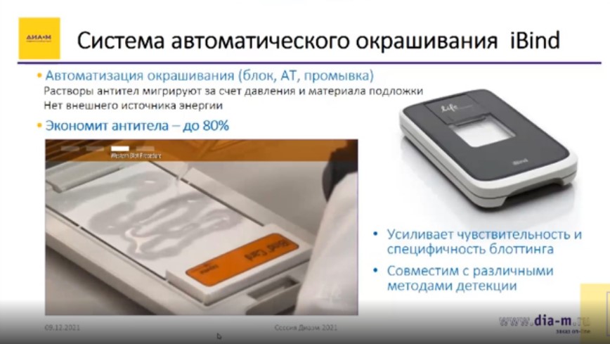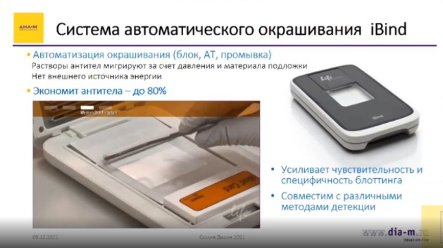 Преимущества системы автоматического окрашивания iBind в том, что при автоматизированном окрашивании растворы антител мигрируют за счет давления и материала подложки без применения внешнего источника энергии. Применение устройства, совместимого с различными системами детекции, не только позволяет экономить до 80% антител, но и усиливает специфичность и чувствительность блоттинга.