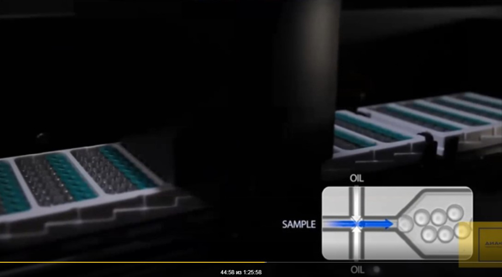 Дальше эти капли попадают в оборудование для амплификации на чипе, в котором эти капли иммобилизованы так, что каждая попадает в одну ячейку. А ячеек много, их может быть 20-30 тысяч. Вся проба оказывается разобранной на отдельные капли – на отдельные ячейки, в среднем по одной копии искомой ДНК в каждой.