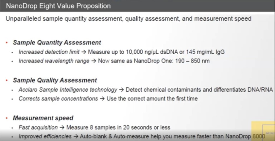 Для тех, кто работает с ДНК, РНК и белком, здесь по анализу проб вроде бы не возникает ничего нового. Уровень точности, надежности и эргономичности NanoDrop One позволяет задействовать их там, где качество полученной пробы играет критическую роль при определении успеха/неудачи последующих этапов – чтобы не возвращаться к длительному процессу пробоподготовки, не тратить дополнительные реагенты на очередную очистку нуклеиновых кислот и дальнейшее выделение исследуемого материала.