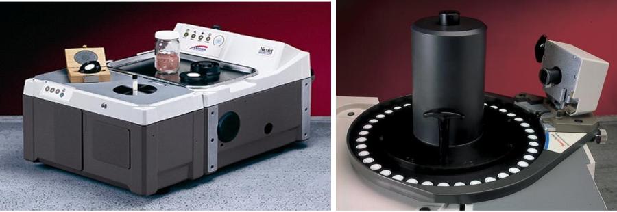 Проба на оптическом окне интегрирующей сферы располагается горизонтально, что облегчает работу. Для работы с порошками прибор комплектуется двумя чашками различного диаметра, которые позволяют снимать спектры и проводить анализ без упаковки, причем большая чашка позволяет вращать пробу в процессе регистрации спектра для усреднения показаний. Предусмотрена также установка устройства автоматического вращения для исследования неоднородных проб большого объема. Кроме того, специально разработанный универсальный держатель таблеток конструкции Nicolet с ирисовой диафрагмой подходит для таблеток любых форм и размеров. Помимо съемки в чашках, интегрирующая сфера дает возможность проводить анализ порошков непосредственно во флаконах, без нарушения упаковки. Для повышения производительности прибора возможна установка карусели для флаконов диаметром от 12 до 28 мм, емкостью от 60 до 30 флаконов соответственно.