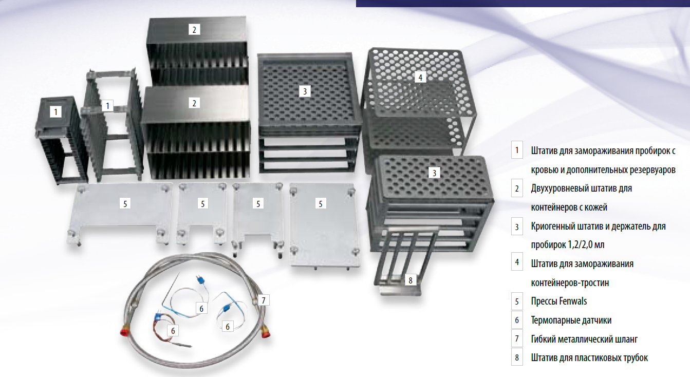• широкий диапазон аксессуаров для замораживания в пробирках, соломинах и мешках;