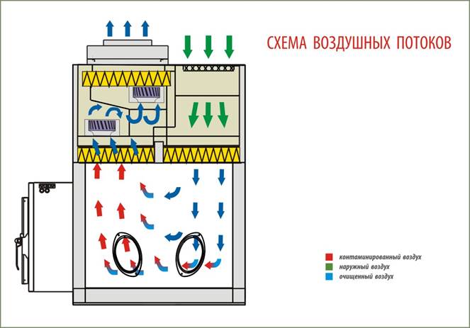 - очистка воздуха, поступающего в рабочую камеру, двухступенчатая: происходит через предварительный фильтр грубой очистки G4 и приточный НЕРА-фильтр Н14, расположенный над рабочей камерой;