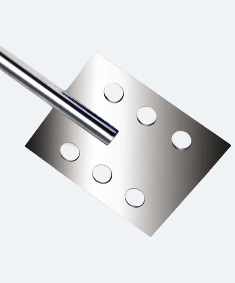 Лопастной перемешивающий элемент, лопасти которого имеют форму квадрата с шестью отверстиями для оптимального перемешивающего потока. Предназначен для использования с верхнеприводными мешалками Fluko.