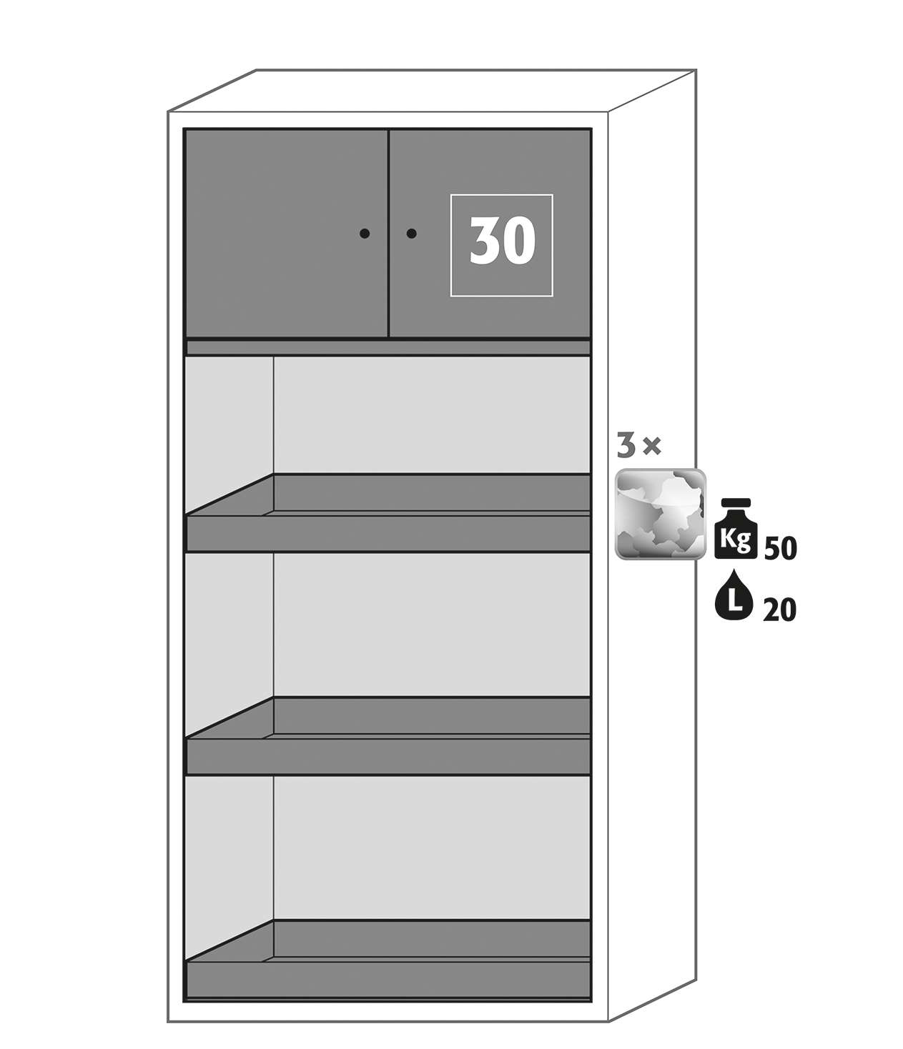 • исполнение шкафа CF-Classic-F для апробированного хранения легковоспламеняющихся опасных материалов в рабочих помещениях в соответствии с EN 14470-1 с безопасным ящиком тип 30: