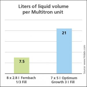В шейкере-инкубаторе Multitron Cell можно разместить 7 колб Optimum Growth по 5 л с общим объемом культуральной среды 21 литр, вместо 8 колб по 2,8 л с общим объемом рабочей среды 7,5 литров.