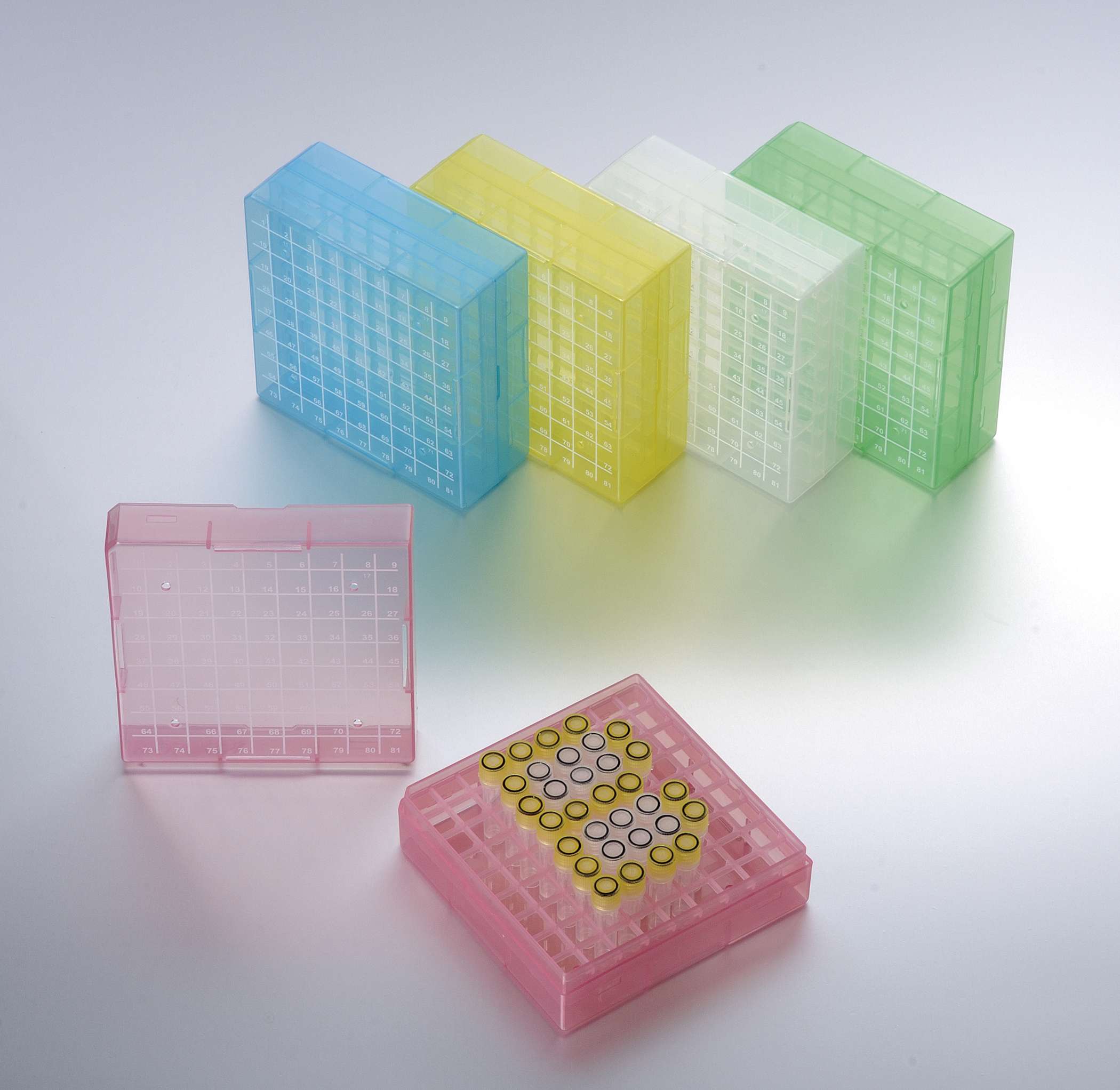 Штатив для хранения криопробирок 1-2 мл, 81 место, полипропилен, с крышкой, набор разных цветов, Biologix, Китай