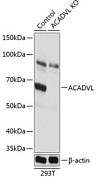 Вестерн-блот-анализ экстрактов нормальных (контрольных) и нокаутных по ABCF2 (KO) клеток 293T с использованием антитела ABCF2 (A19950) в разведении 1:1000.