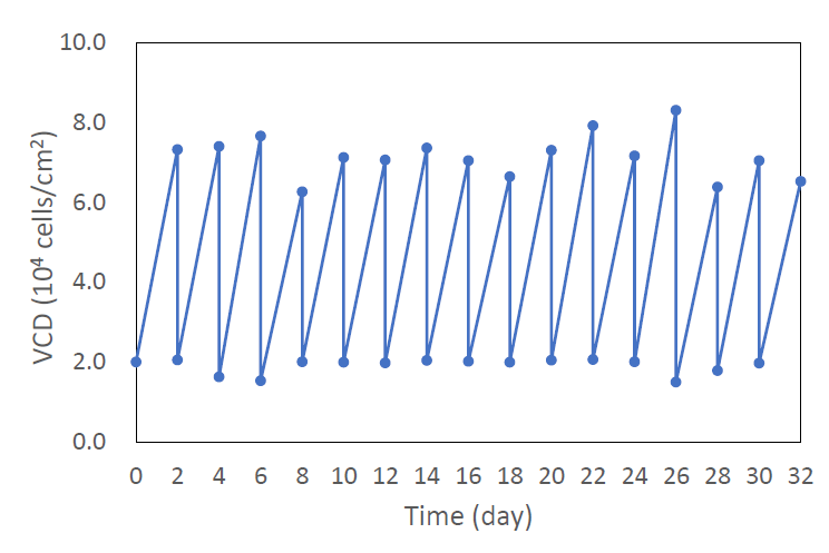 Периодическое культивирование с подпиткой Hyber-F100S суспензионных гибридомных клеток в бессывороточной среде Hyber-B100 представляет собой эффективный метод для достижения высоких показателей жизнеспособных клеток.