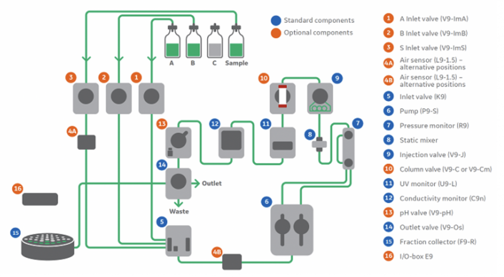 Хроматографическая система AKTAgo компании Cytiva (бывшая GE) позволяет автоматически осуществлять тонкую очистку белков (FPLC), антител, полисахаридов, липидов и других биомолекул. Эта компактная модульная система оборудована высокопроизводительным двух-плунжерным насосом Ystem, смесителем с возможностью создания градиента на стороне низкого давления, автоматической системой защиты колонок, разными типами детекторов и системой клапанов. При необходимости AKTAgo можно переводить в энергосберегающий режим работы, снижая энергопотребление на 75%.