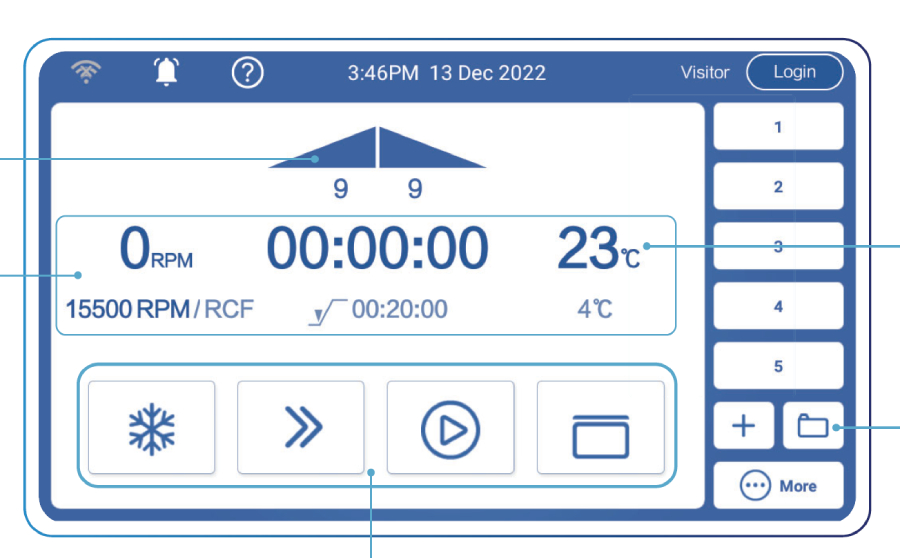 Низкая высота центрифуги (высота с открытой крышкой всего 85 см) позволяет облегчить процедуру загрузки-разгрузки центрифуги. Крышка центрифуги закрывается легким нажатием. Существенно повышают экономичность центрифуги функция Fast Temp pro, которая позволяет запустить предварительное охлаждение центрифуги в заранее установленные дату и время, а также функция Eco (автоматическое отключение питания при 8-часовом перерыве в работе).
